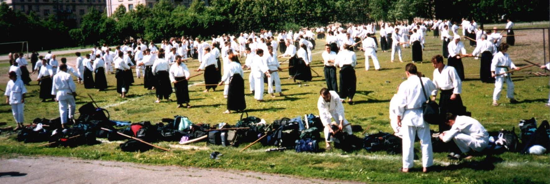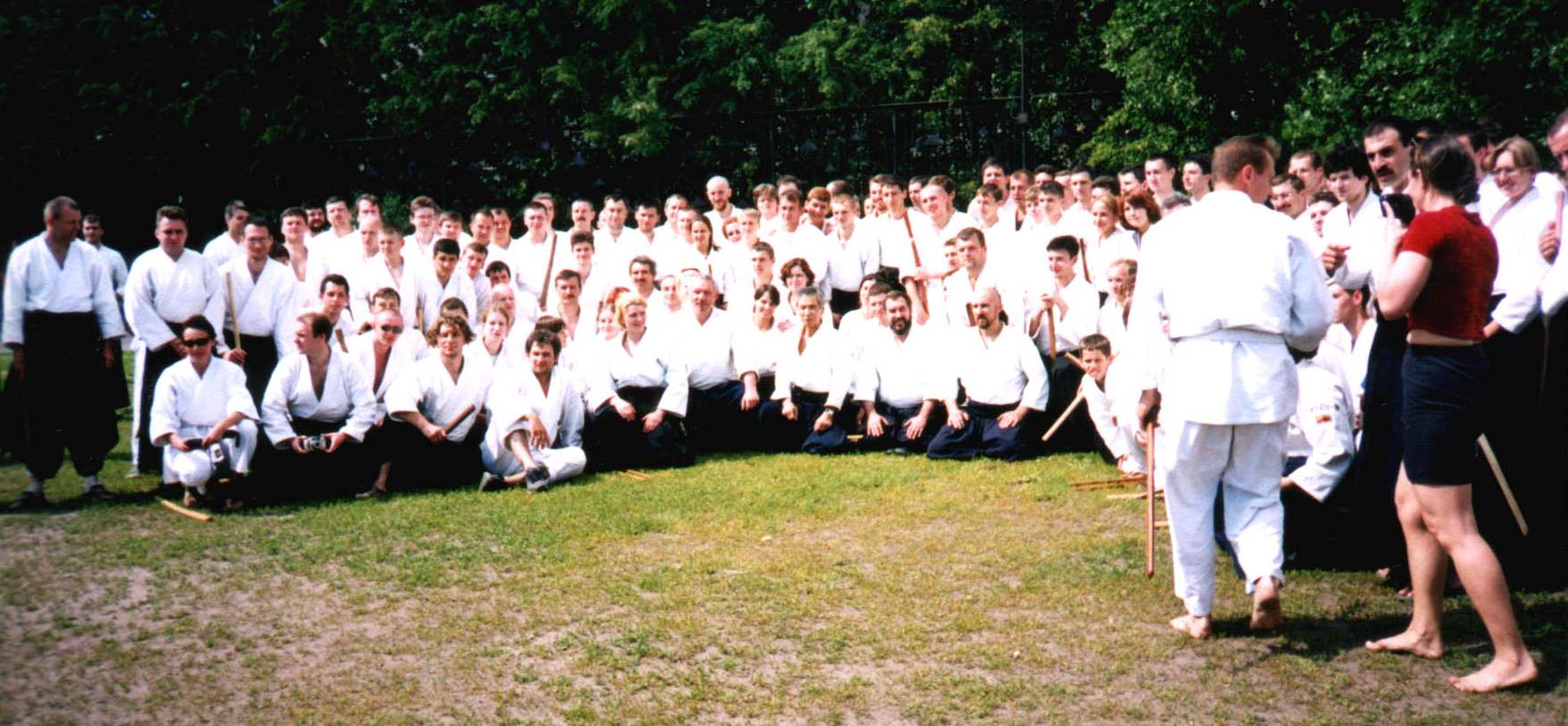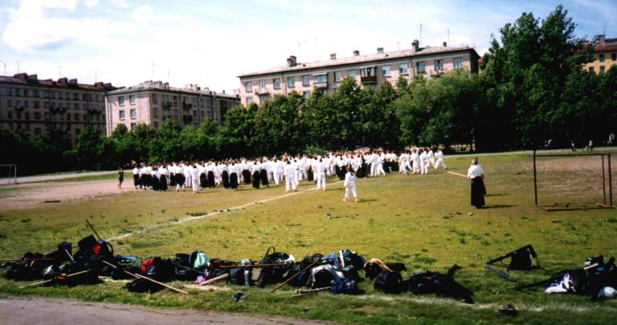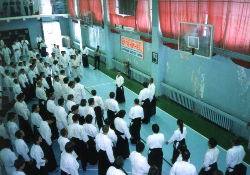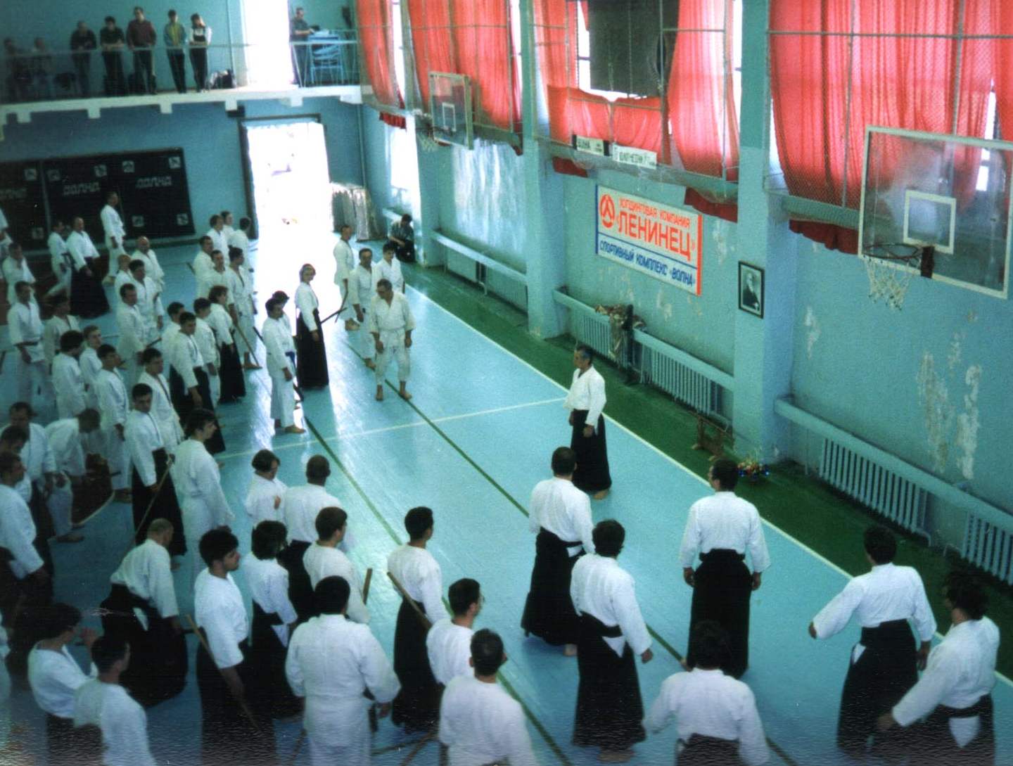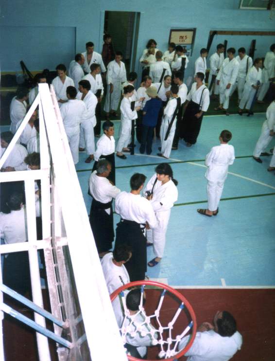 Жена Тамуры Тамура Тамура Занятие, как всегда, началось с дыхательных упражнений Разминка... Паевская разминает Вычика :) Паевская всё ещё разминает Вычика :)) Хранители сертификатов (коробка видна по центру) Стефан в массах ...а тем временем на беговой дорожке... Перспектива чуток сверху Работа с оружием: дзё Тамура что-то обьясняет Работа с оружием: бокэн